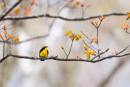 Bird (Narcissus Flycatcher, Ficedula narcissina) male black, orange, orange-yellow color perched on a tree in a nature wild and risk of extinction