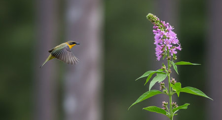 A yellow-throated oriole perched on a purple flower
