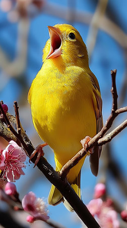A vibrant yellow canary perched on a branch vocalizes joyfully among delicate pink blossoms. This enchanting scene captures the beauty of spring in a serene garden setting.