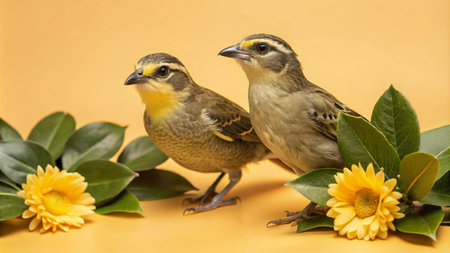 Two small brown birds with yellow accents and yellow flowers on a yellow background.