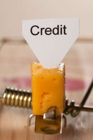Mousetrap with loan bait on blue-pink pastel background. Traps, risks or deception concept