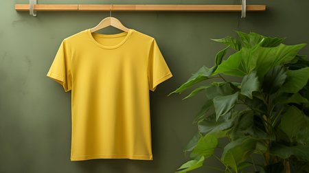 Blank yellow tshirt template hangs on wooden hanger against soft green wall, ai generated. T-shirt mockup advertising image. Short-sleeved design. Apparel casual clothes mock up product photorealistic