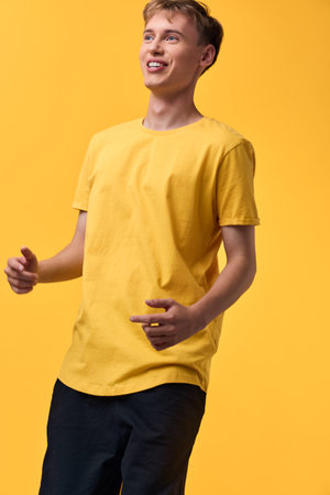 Young man wearing a yellow shirt stands against a matching yellow background, smiling and gesturing, a casual studio shot capturing lively mood, color harmony and approachable lifestyle