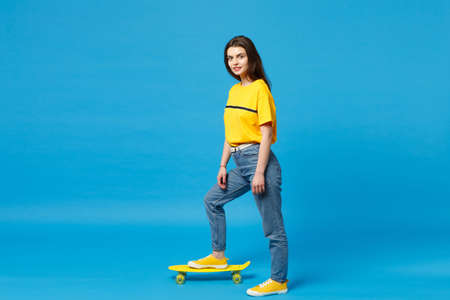 Side view of attractive young woman in vivid casual clothes looking camera, standing with yellow skateboard isolated on blue wall background in studio. People lifestyle concept. Mock up copy space