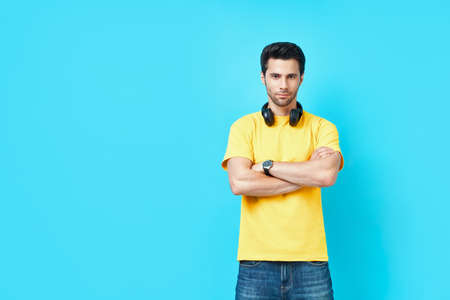 Studio shot of a positive hipster guy with beard wearing yellow beanie and casual t-shirt posing with crossed arms isolated on yellow background. Copy space for your text or design. Copy space.@240805_