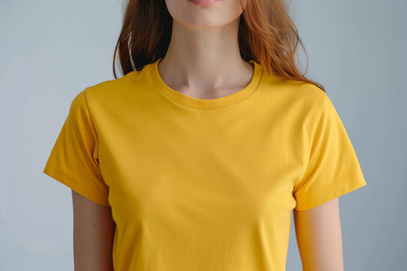 Cropped image of a young woman wearing a plain yellow t-shirt, standing against a gray backdrop