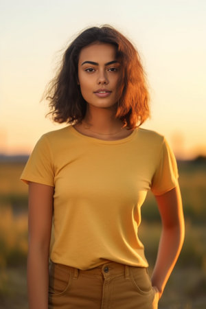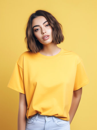 A thoughtful young woman stands against a soft, neutral backdrop, wearing a bright yellow t-shirt that radiates warmth and positivity. Her gentle expression and casual pose invite a sense of connection, making this image perfect for themes of youth, style, and self-reflection.