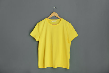 Yellow plain shirtsleeve cotton T-Shirt mockup on wooden hanger Gray background Organic cotton manufacture Space for text design
