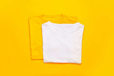 White and yellow T-shirt painted in tie dye style on a white and yellow background. Minimal fashion concept. flat lay.