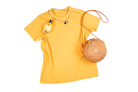 Blank yellow female t-shirt mockup on white isolated background with straw bag.