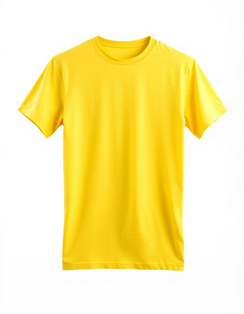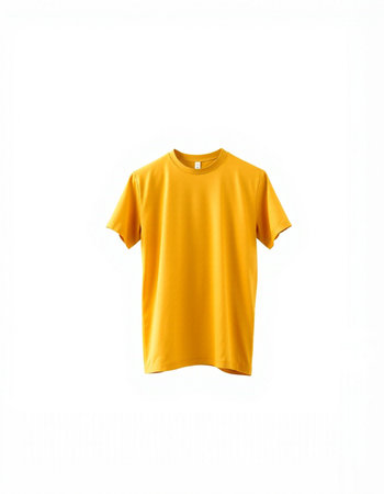a yellow short sleeved t shirt with a round neck is photographed on a plain white background studio shot