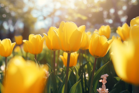 AI Generated. A field of yellow tulips with a bright sun shining on them