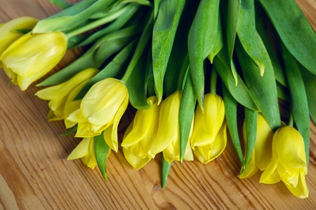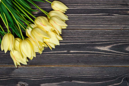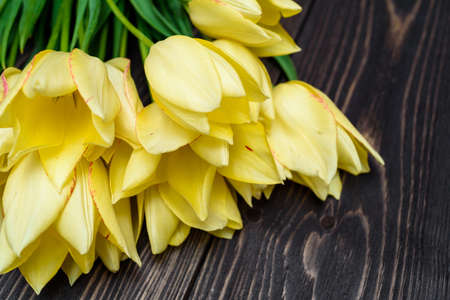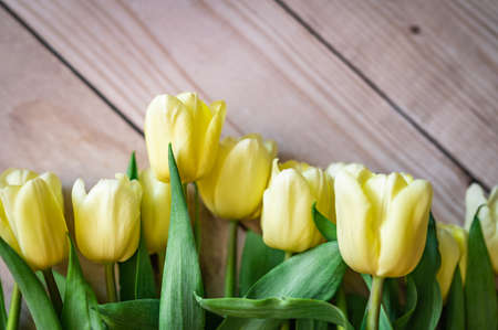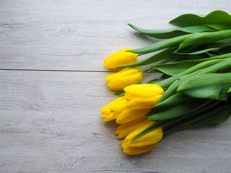 Spring background with bunch of tulip flowers, copy space. Bouquet of yellow tulip flowers on wooden background. Holiday greeting card for Valentine's Day, Woman's Day (March 8), Mother's Day, Easter