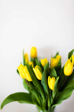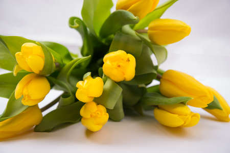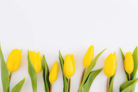 Flat lay with yellow tulip flowers on white background. Concept for greeting card for Easter, Mother's day, International women's day, Saint Valentine's day. High quality photo