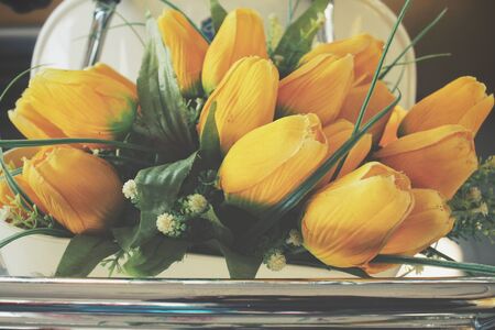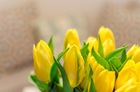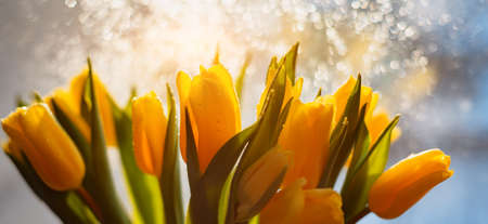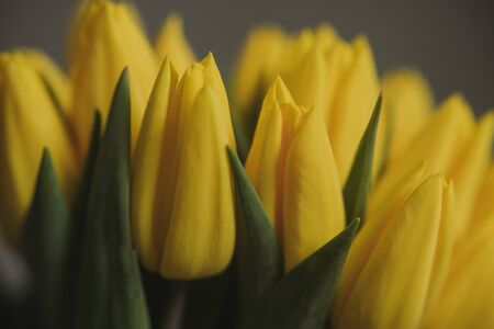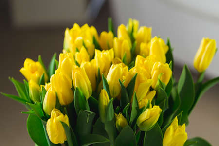 Bouquet of beautiful spring yellow colorful blurry tulips on bokeh background. Lovely season sunny flowers with soft color filter and selective focus with place for text message. The depth of field is short defocused.