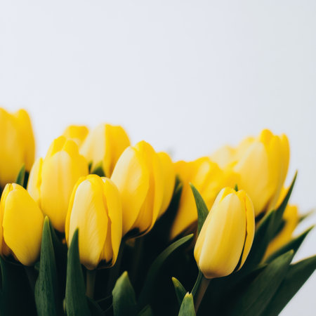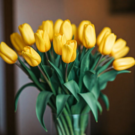 A beautiful arrangement of yellow tulips surrounded by fresh green leaves showcases the essence of spring. Softly illuminated, the flowers radiate warmth and joy, perfect for any occasion.