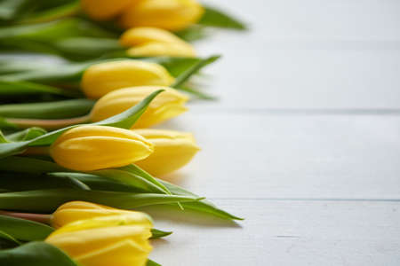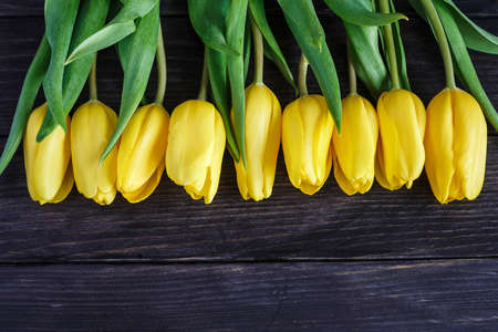 Spring background with bunch of tulip flowers, copy space. Yellow tulips on wooden background. Flat lay, top view. Holiday greeting card for Valentine's Day, Woman's Day (March 8, Mother's Day, Easter