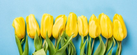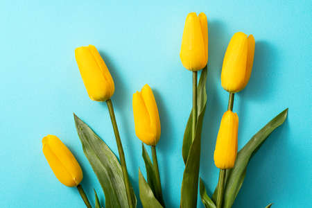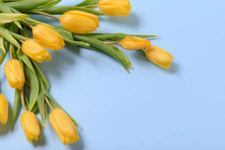 Yellow tulips on blue background. Floral bouquet of fresh flowers on light blue background.