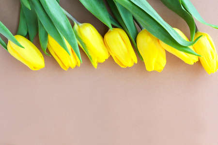yellow tulips on a beige background. Beautiful spring-yellow flowers. A gift for a woman on a holiday or a sign of attention