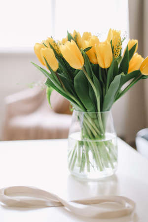 A bouquet of fresh yellow tulips. A bouquet of tulips on the table in front of the window with plants. Spring flowers in the interior. The concept of spring or holiday, March 8, International Women's Day, birthday.