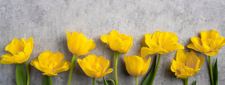 A stunning display of vibrant yellow tulips is artfully positioned on a soft gray surface, creating a harmonious contrast. The fresh blooms evoke feelings of joy and renewal, perfect for celebrating new beginnings or brightening any space.