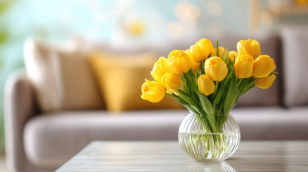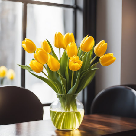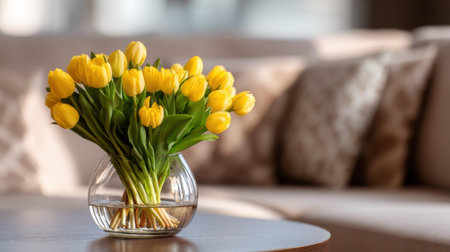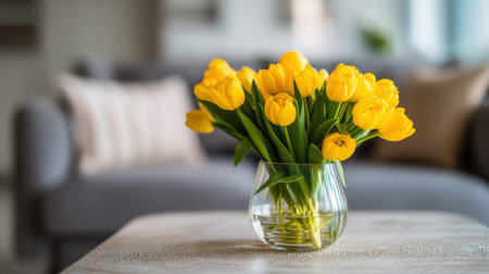 A beautiful arrangement of vibrant yellow tulips in a glass vase, showcased on a stylish wooden table, adding a touch of elegance to a bright and cozy living space.