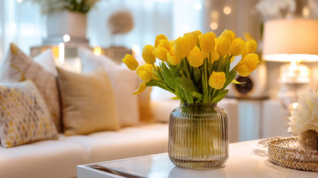 A beautiful arrangement of yellow tulips in a decorative vase adds a fresh touch to a modern living room filled with cozy furnishings and soft lighting.