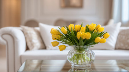 A bright bouquet of yellow tulips in a clear vase sits on a table, enhancing the cozy atmosphere of a stylish living room with soft furnishings and warm lights.