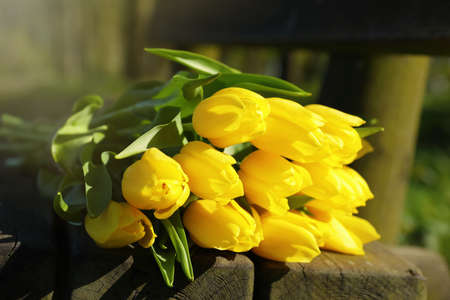 Bouquet of beautiful yellow tulips on wooden bench outdoors, closeup