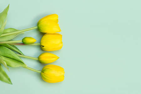Yellow tulip flowers bouquet on mint background. Flat lay, top view. Minimal floral concept. Spring flowers, floral background with copyspace