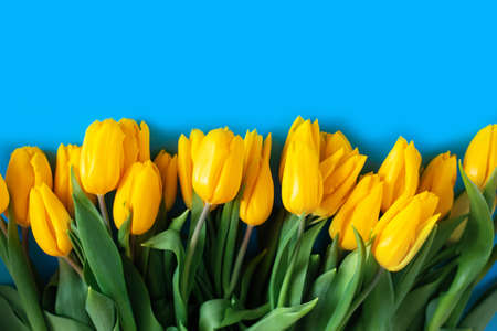 Yellow tulips on a blue. Beautiful floral background. Also a symbol of Ukraine.
