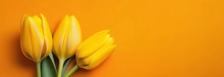 Yellow spring tulips lie on an orange background. Background for your business or postcard for Mother's Day, March 8th, birthday, celebration invitation. Web banner with copy space. Generative AI