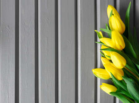 Yellow tulips bunch, bouquet, green leaves on side of gray wooden planks background.Copy space, horizontal banner.Season modern minimalistic design, trend color of the year 2021, cover for printed product.