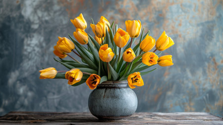 A stunning bouquet of bright yellow tulips is artfully arranged on a smooth gray surface, radiating warmth and joy. The lush green leaves complement the cheerful blooms, creating a harmonious and uplifting atmosphere.