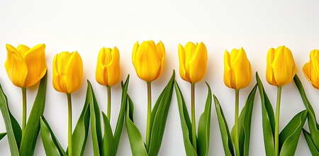 Row of yellow tulips on white background. Spring and new beginnings concept.