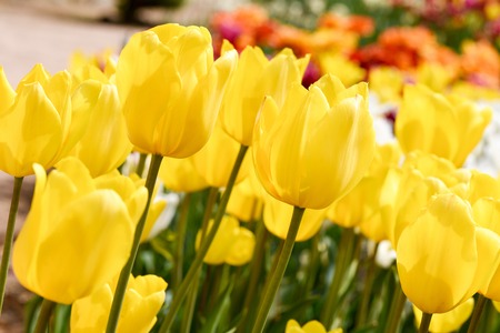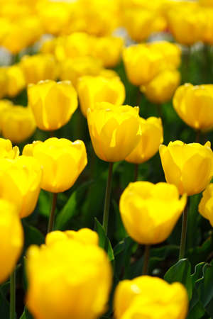 Yellow tulips in full bloom at the tulip festival. Beauty of nature concept. Spring nature, floral garden park lush foliage. Sunny closeup, vibrant colors