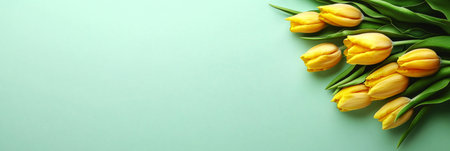 A minimalistic top view shows vibrant bright yellow tulips on the right, with a serene mint-colored background and space for custom text or design, banner