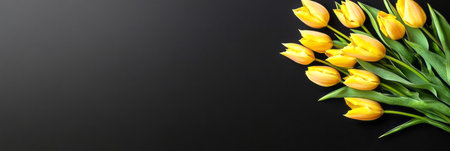 Yellow tulips arranged in a lush bouquet, set against a clean black plain background, offering a minimalist design perfect for a holiday mockup with plenty of space, banner