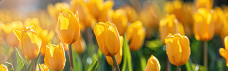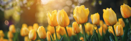A close-up image of a field of yellow tulips in full bloom. The flowers are bathed in warm sunlight, creating a radiant and cheerful atmosphere. The soft focus of the background emphasizes the beauty of the blooming tulips in the forefront.