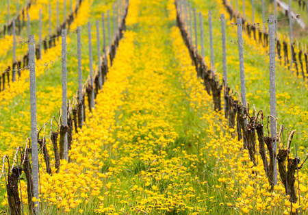 Detail of the blossom of yellow turkish tulip by ancient vine in vineyard in Castell Bavaria Germany in spring when the flowers bloom