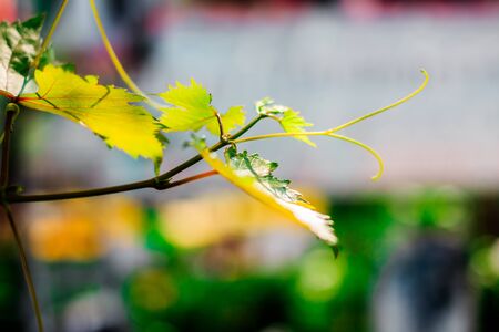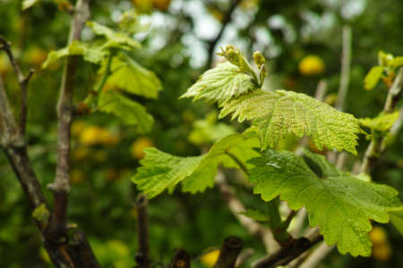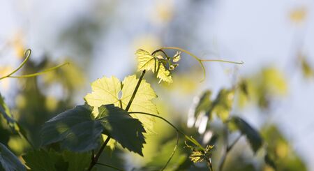 gentle young green grape leaves and mustache on grapevine, in the spring, closeup, spring background