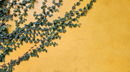 A yellow wall with ivy extending into the frame creating a unique and interesting image perfect for use with text or as a background.