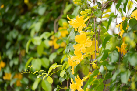 Beautiful yellow flowers with green leaves fence background,Cat's Claw, Catclaw Vine, Cat's Claw Creeper plants