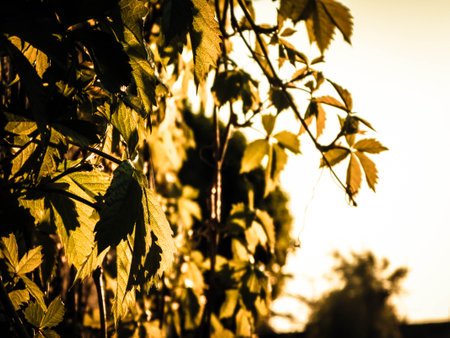 Silhouette of green leaves against the sunset. Natural background.
