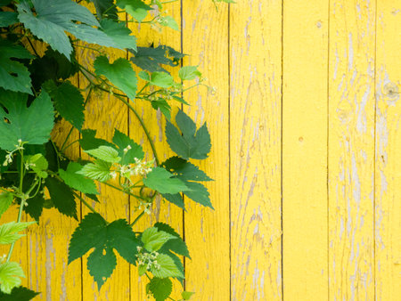 Juicy green grape leaves on the wooden yellow wall. Natural summer background. Copy space, empty template for text