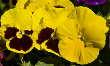 Close-up of purple yellow pansies in the garden