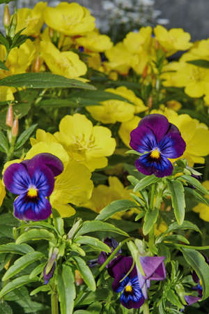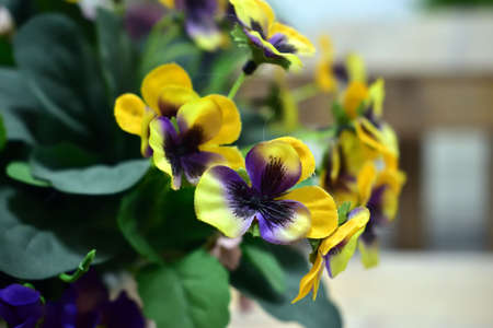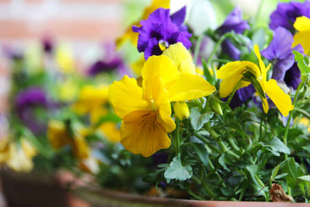 Yellow and purple pansy flowers growing on the wall, closeup