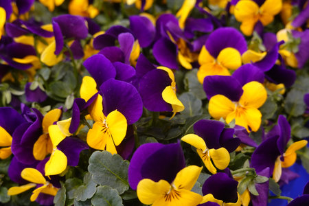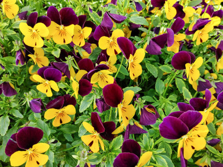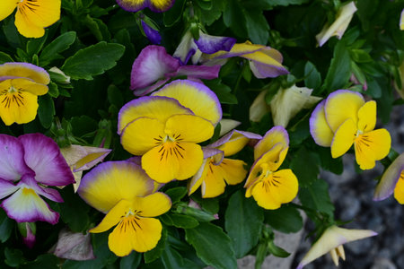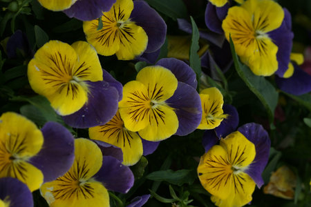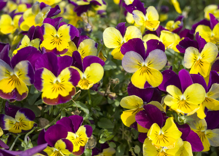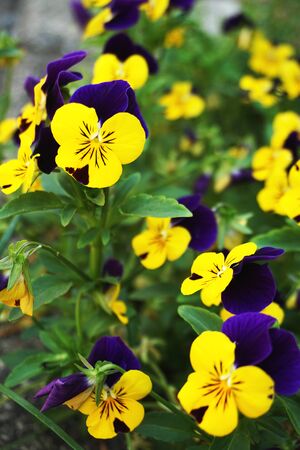A group of garden pansies in a combination of yellow-violet colors. Two-color perennial purple-yellow pansies flowers in a flower bed.