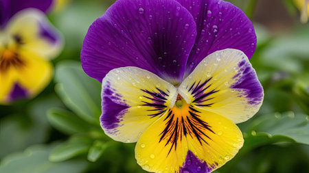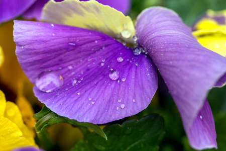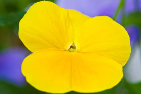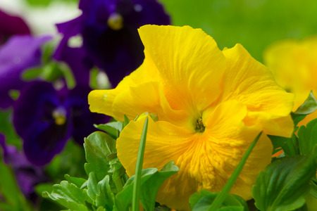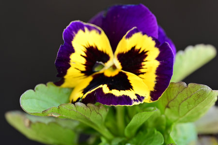Closeup on yellow and purple pansy flower in springtime
