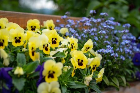 Flowerbed with yellow and blue violas. Focus on lower third.
